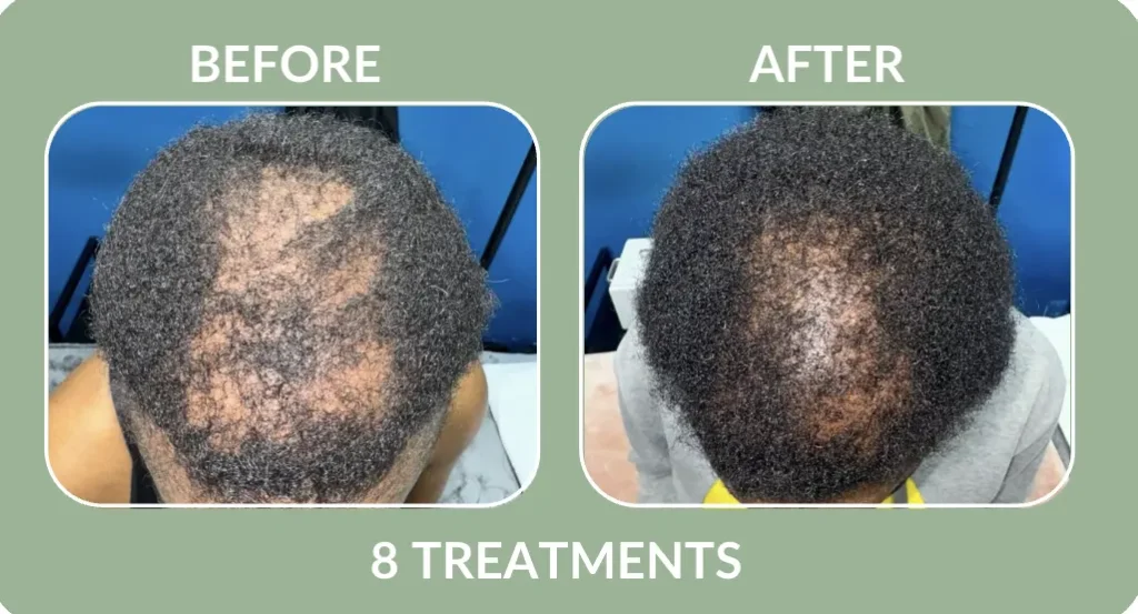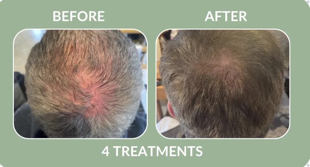 Hair regrowth is a process, and results vary by individual. A series of 6 treatments is typically recommended to support real follicle stimulation and hair density. After your initial series, maintenance is suggested once every 6-12 months depending on your hair goals and how your scalp responds.